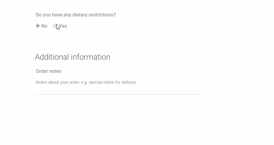 You can see our conditional logic at work below. If a user doesn’t have any dietary restrictions, then they can move straight onto the next field. If they mark that they do, then a new field appears allowing their dietary preference to be entered.