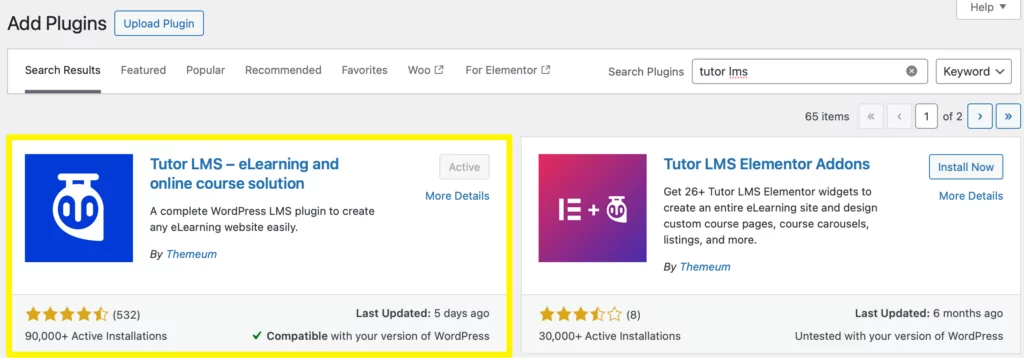 If you’re using the free plugin, you can install it directly through the WordPress dashboard by going to Plugins → Add New. Then, find Tutor LMS using the search bar and click on Install Now → Activate: