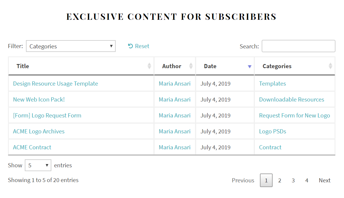 Additionally, the table is intuitive and incredibly easy to use. Your site’s members and visitors will be able to use the search bar, sortable columns, and filter dropdowns to quickly find the content they’re looking for. It’s much more user-friendly than listing members-only content in a standard blog-style layout.