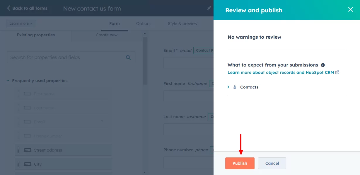 Next, review your form to eliminate errors and click Publish: