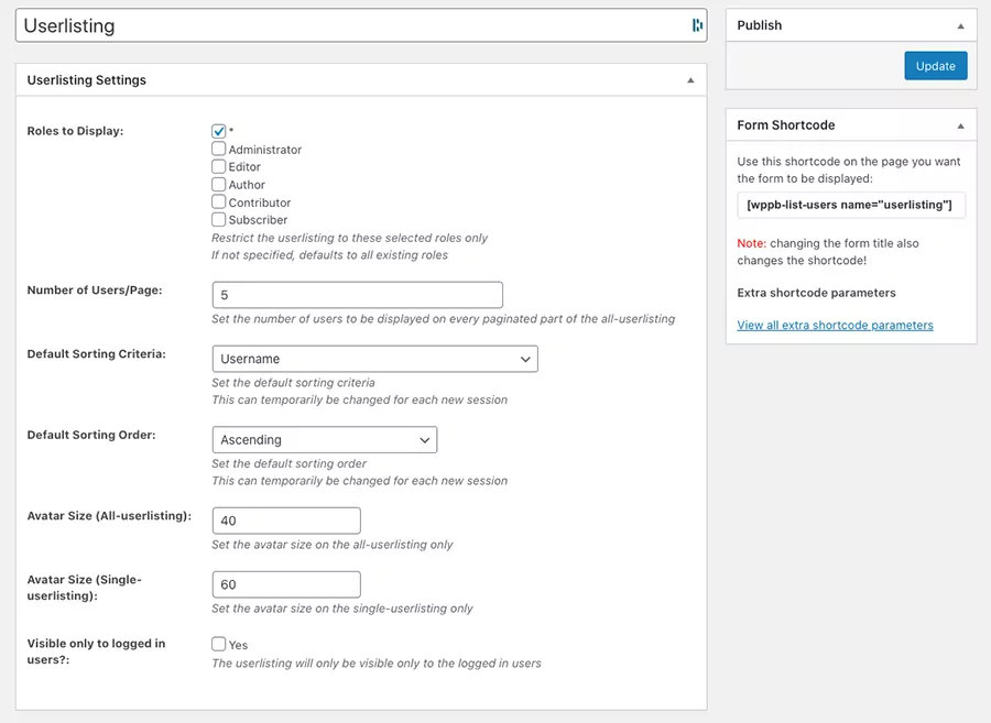 - Visibility – with this, you can set the User Listing to be visible only to logged in users. Optionally, you can set which user roles can see the user listing Restrict the User Listing visibility to logged in users only.