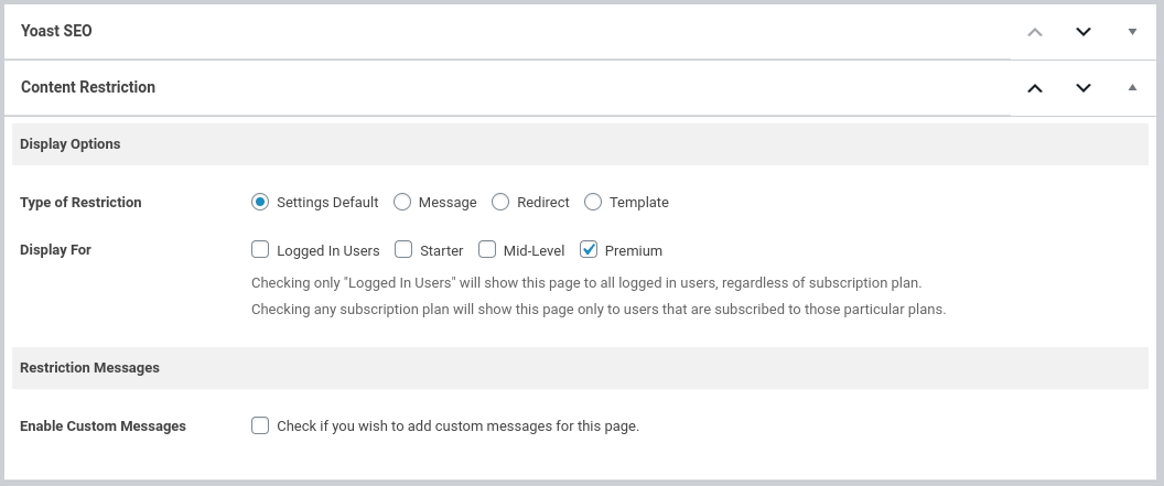 If you already have a ton of content on your site, then you might want to save a ton of time and use the Global Content Restriction add-on. With this add-on you can mange what type of content is available for each subscription plan on a global level, so you don’t have to do every page or post individually.